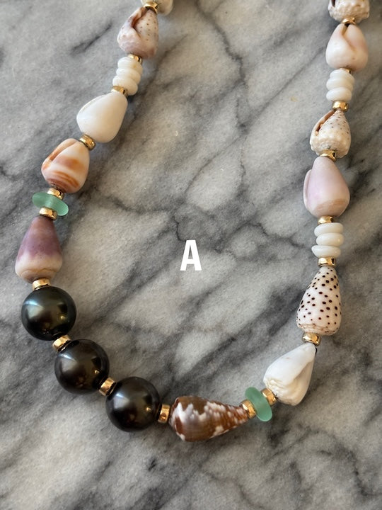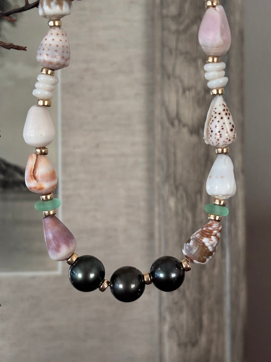 3 huge Tahitian pearls, Hawaiian baby cone, puka shells, and sea glass necklace