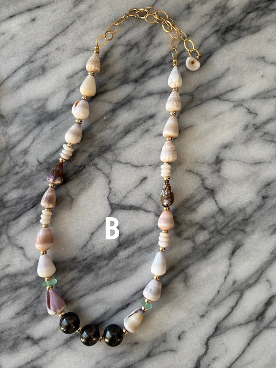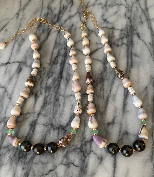 18 Hawaiian baby pastel colored cone shells (1/2" or less), 12 Hawaiian surf tumbled Puka shells, and beautiful green sea foam glass. All separated by high quality 14K gold filled polished beads