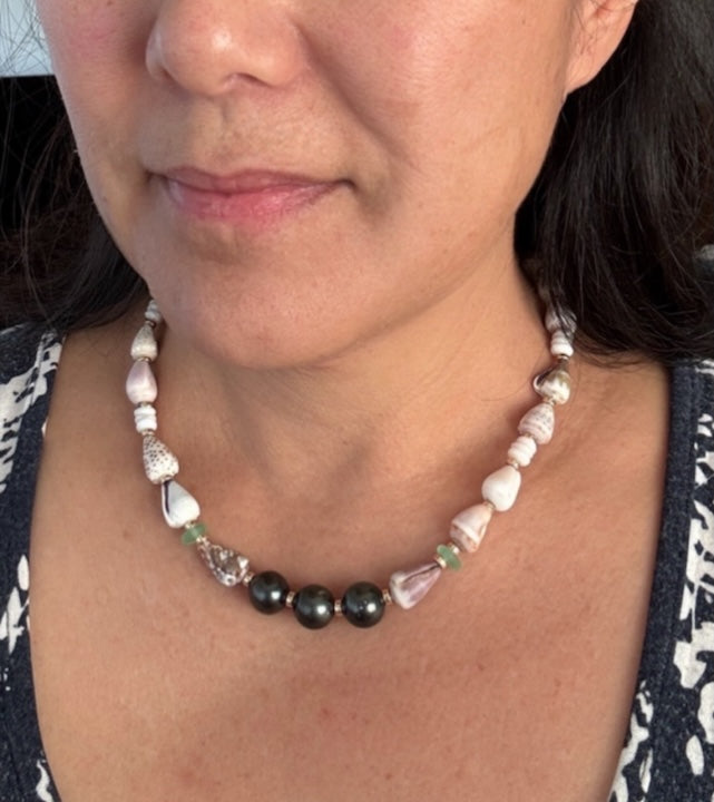 3 Huge 11mm+ Tahitian pearls, Hawaiian baby cone shells and sea glass necklace